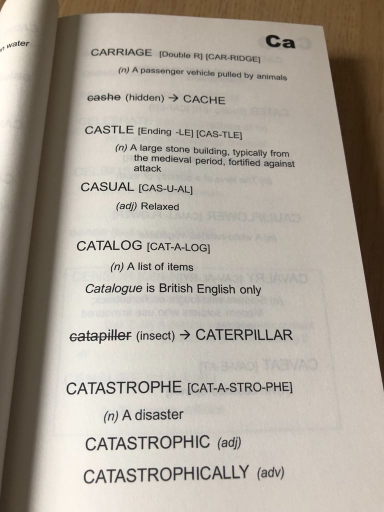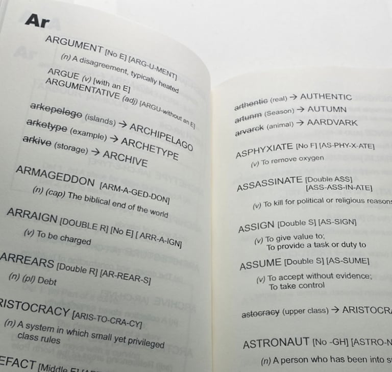 This is where The Dyslexia Dictionary is different. There are over 400 deliberately misspelled words included to help signpost the reader to the correct spelling. All these misspellings are clearly marked with a brief definition, and are placed at the most likely places to divert then reader to the correct spelling.